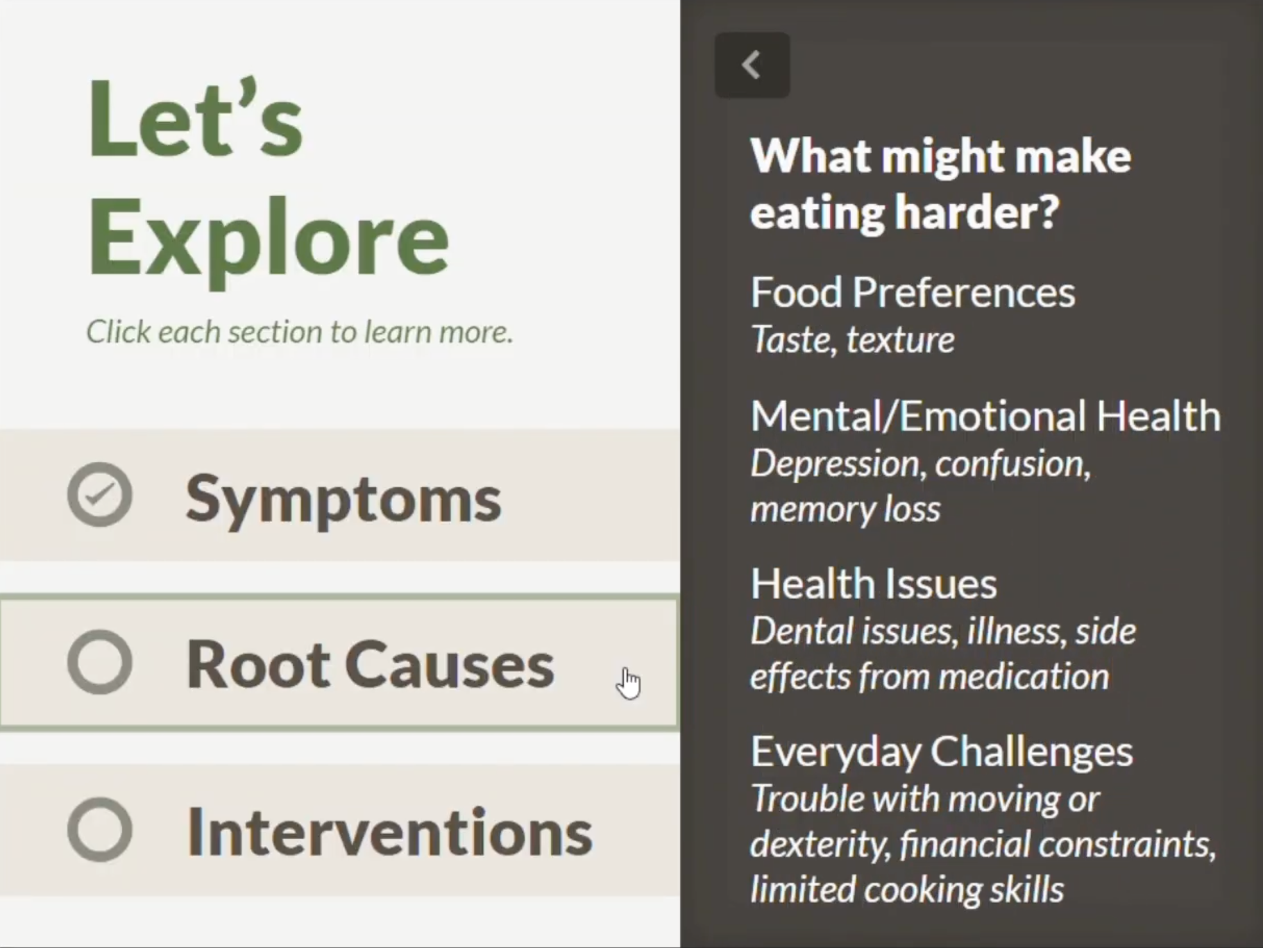 - Root causes, aka the various reasons older adults may find it more difficult to get adequate nutrition from their diet, and